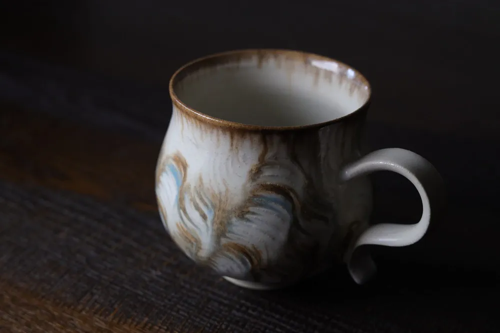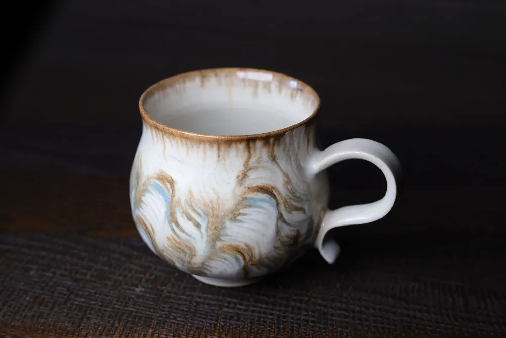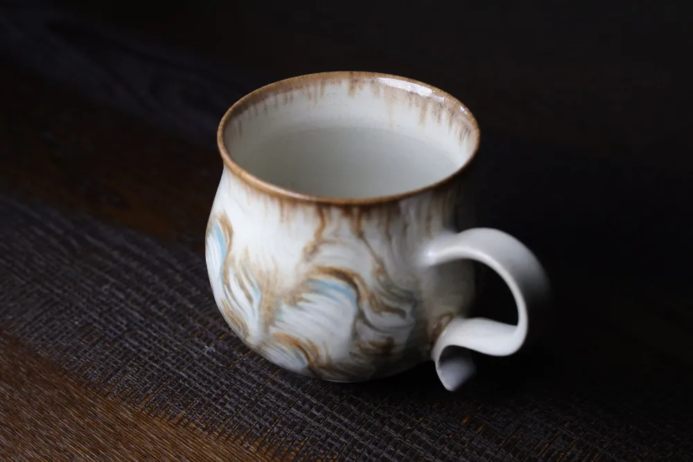ユニークなねじれた取手が目を引く、存在感のあるマグカップ。